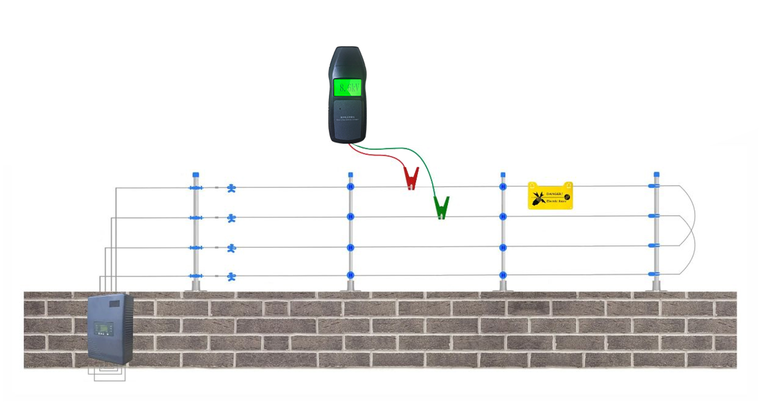 1.脈沖主機電壓測量 :脈沖主機布防工作後,把脈沖電壓測量儀的夾具分布夾在脈沖圍欄上任意相鄰的兩根線上 ,如下圖所示: