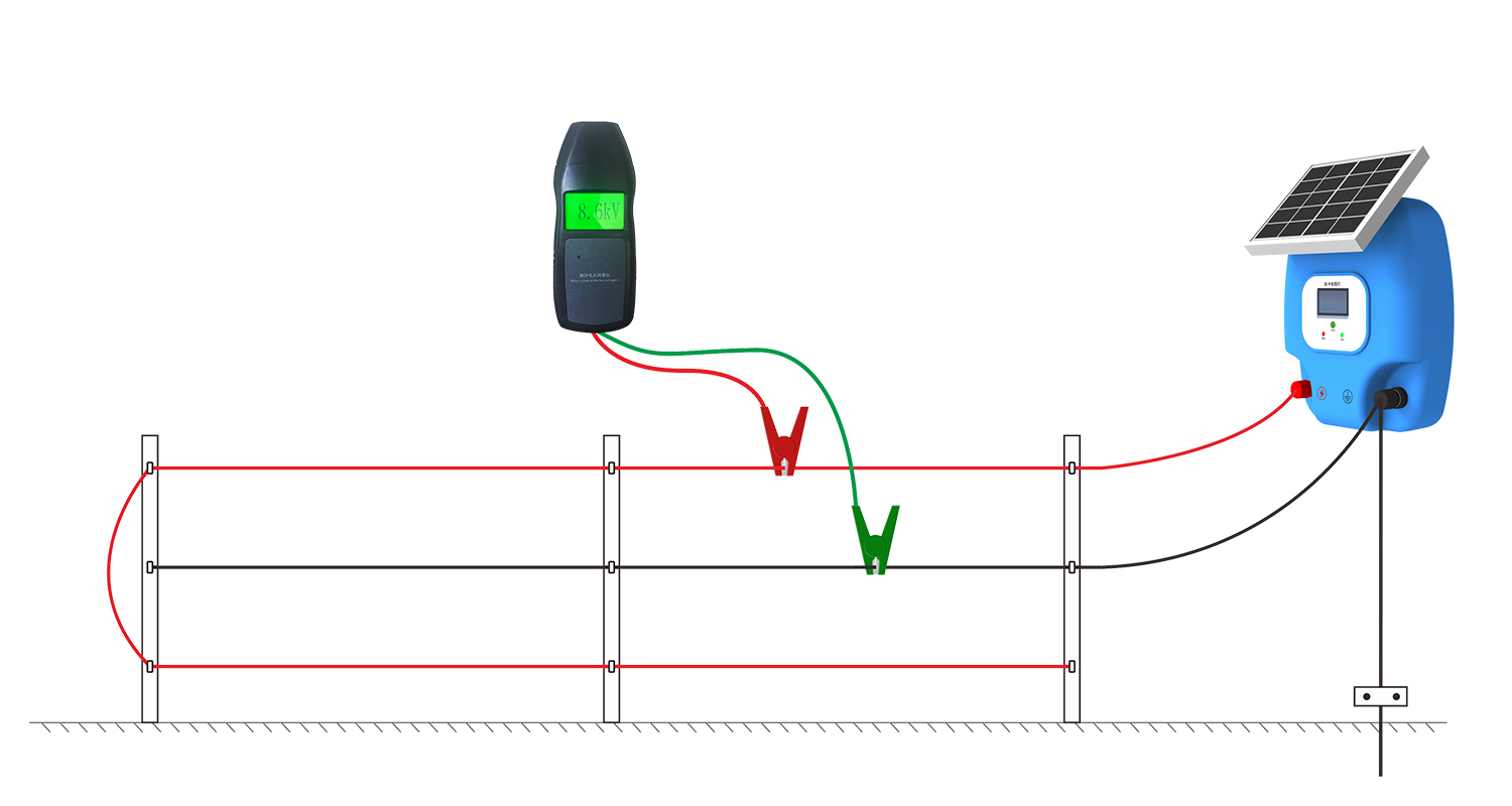 2.畜牧電圍欄電壓測量:畜牧電圍欄主機通電工作後 ,把脈沖電影測量儀的紅色夾具夾在電圍欄脈沖輸出線上,綠色夾具夾在電圍欄接地線上,如下圖所示: