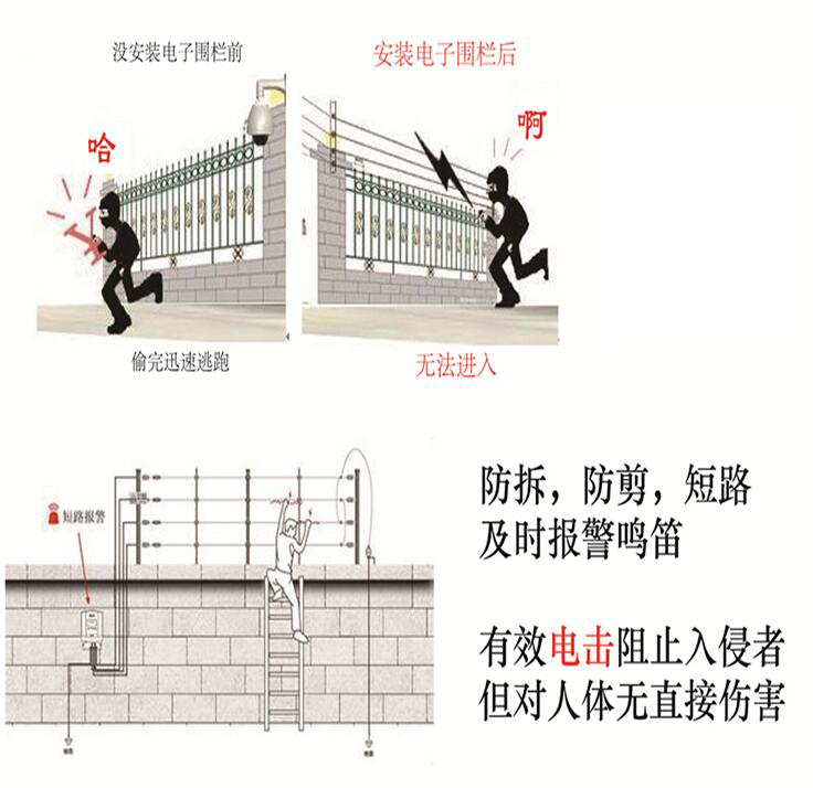 電子圍欄新的安防構思,是以阻擋爲主,報警爲輔。以阻擋、報警、監控爲一體,系統對入侵者給予瞬間脈沖電擊。具有極強的威懾作用。防止事件的發生,減少事件後處理工作量 ,減少社會犯罪率 。電子圍欄可同警燈、警鈴、攝像等聯合使用 ,可遠程監控,可形成智能化。